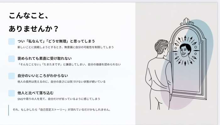 今回お届けしたのは「私なんて…めがね」です。 ついつい、「私なんて…」「人と比べて落ち込んでしまう」と言ったことはありませんか? 「私なんて…」と自分を小さくしてしまう心のストーリー気づき、あなたの内なる批判的な声を、優しい応援者の声に変えてみるワークです。